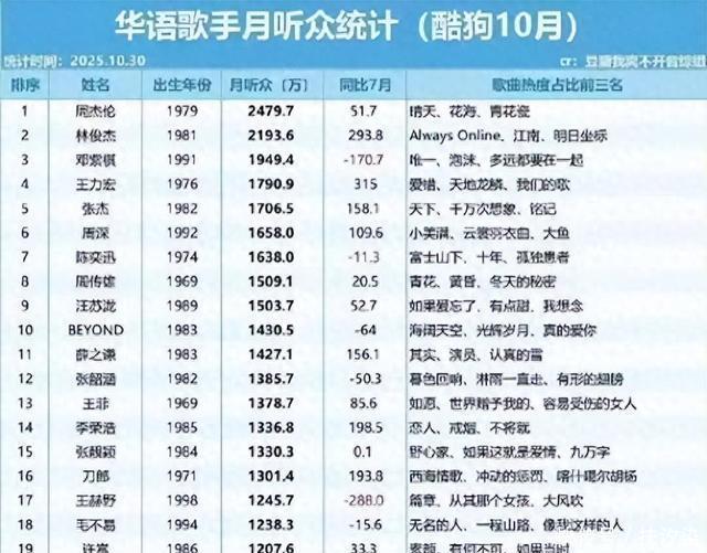 如果要说当前乐坛最真实的音乐平台是什么,那么酷狗音乐必须拥有姓名。 透过酷狗音乐平台歌手榜,我们可以知道当前主流歌手在下沉市场的真实情况。 因为,酷狗音乐覆盖的年龄段足够广,有着大量中老年人使用,下面,我们一起来看看最新的数据吧!