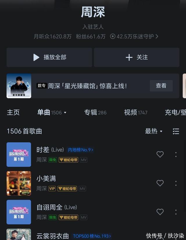 02 接下来我们聊聊6-10名,他们分别是:周深、陈奕迅、周传雄、汪苏泷和beyond。 6-10名,几乎完全和QQ音乐方面不一样了。 我们先聊聊差一步进入前5的周深,以前一直和大家说,大多数人都在自己的信息茧房里,面对客观的数据,反倒是选择了质疑,更坚信“身边即世界”。