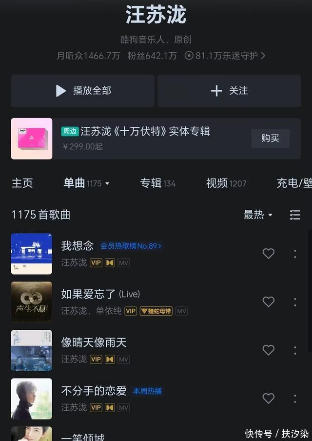 对《小美满》、《云裳羽衣曲》成为爆款的事实不知,成天念叨的依然还是“只有《大鱼》”这一句话。 周深的市场到底在哪里,我并不完全清楚,但是从酷狗音乐目前的数据以及演出市场的火爆是可以得出一个结论的:周深并不缺听众,无论是线上还是线下。 接着聊聊汪苏泷,汪苏泷排名第九这个数据并不算优秀。 《如果爱忘了》、《有点甜》和《我想念》是歌曲热度占比前三名,这一点倒是和QQ音乐方面的数据相同。 只是,坐拥这么多大爆款,走着创作歌手路线的汪苏泷,是理应进入前五的,只能说有点不及预期。